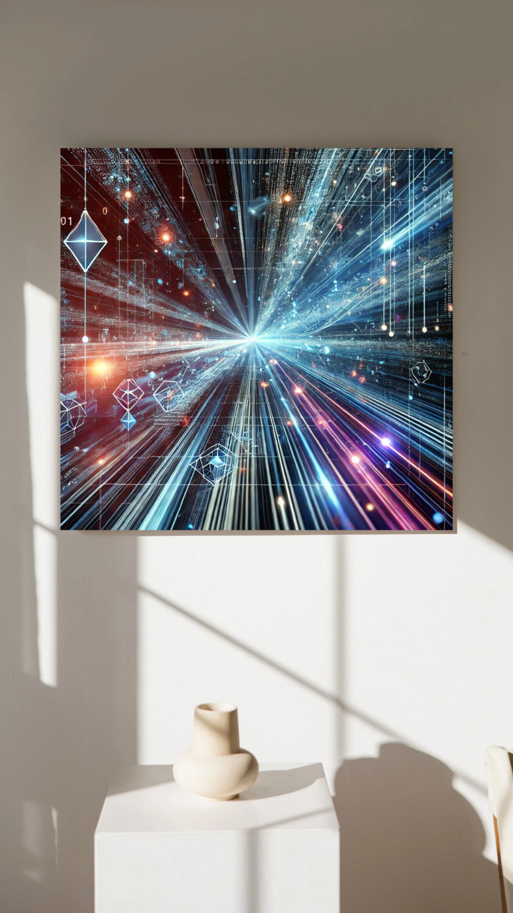 In real life, data traveling through cyberspace is fundamental to modern communication, powering everything from financial transactions and cloud computing to AI processing and cybersecurity. This artwork symbolizes how digital networks interconnect people, businesses, and devices across the globe, enabling seamless information exchange. The visualization reflects the invisible yet crucial role of data transmission in shaping industries, automation, and the evolution of the internet.
